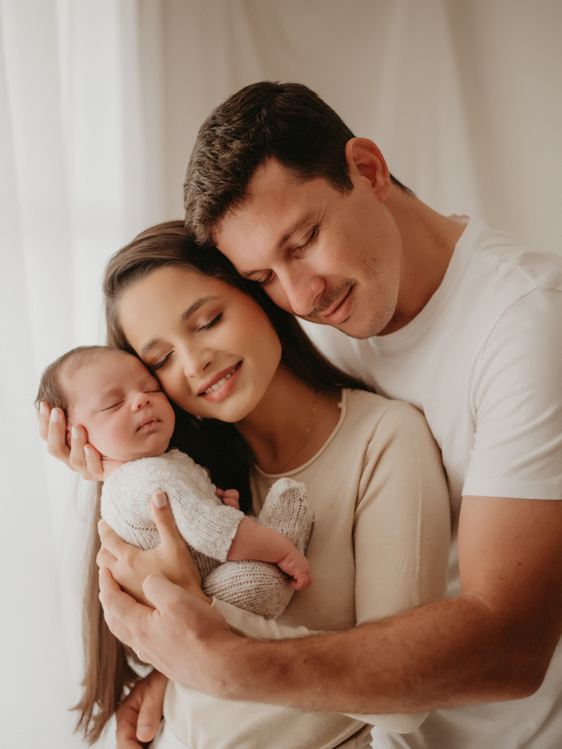 - O ensaio é feito no estilo leve, clean e atemporal, focando na beleza e ternura dos pais com o bebê
